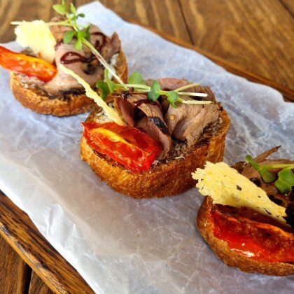 Брускетты с сёмгой – это идеальное сочетание текстур и вкусов. Хрустящая основа из чиабатты гармонично дополняется нежной, деликатно подсоленной рыбой. Кремчиз с тонкими нотками трюфеля придаёт сливочную насыщенность, объединяя все ингредиенты в единую композицию. Вяленые томаты добавляют приятную кислинку и подчеркивают естественную сладость рыбы. Пармезановые чипсы создают лёгкий контраст и делают каждый укус интересным благодаря своей хрустящей структуре.